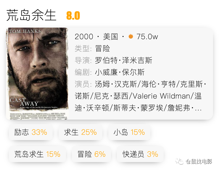《荒岛余生》虽有瑕疵,但很吸引人,剧本很精彩,也是导演罗伯特·泽米基斯最擅长的,汤姆·汉克斯的表演也很出彩。