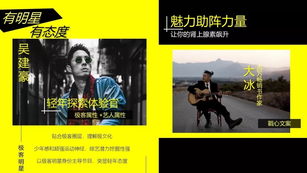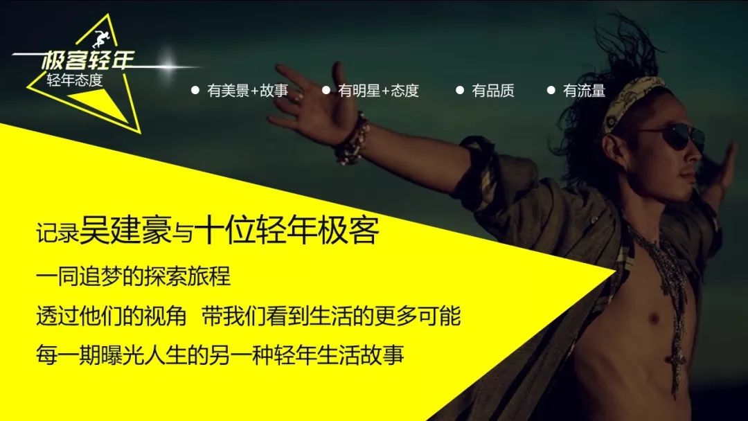 有明星有态度:吴建豪作为轻年探索体验官,跟随极客们去感受不同的极限运动;百万畅销书作家大冰将为节目提供戳心文案