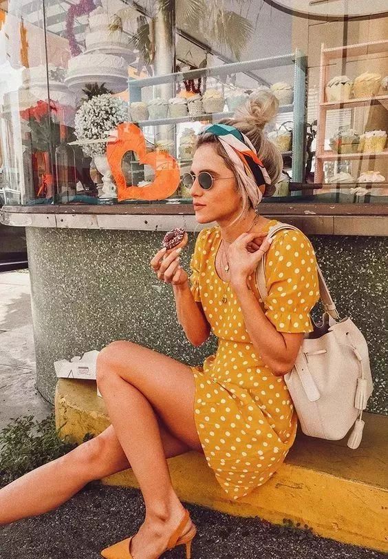 波点连衣裙一定是春夏季节街头最亮丽的风景,既可以穿的沉稳端庄也可以青春洋溢,担心早晚温差的养生派搭配一件外套就够啦。