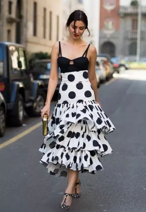 黑色胸衣配上超高腰的波点鱼尾裙,瞬间拉长身高比例,脚上的波点凉鞋也是非常用心在搭配了。