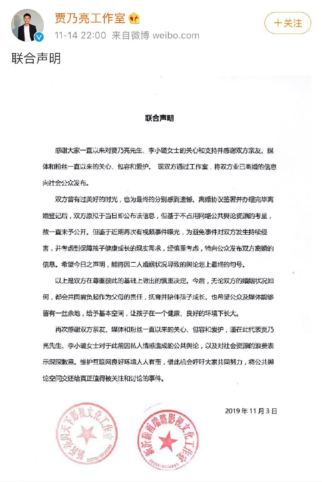 前天深夜,贾乃亮工作室和李小璐工作室同时发布声明,正式宣布离婚。