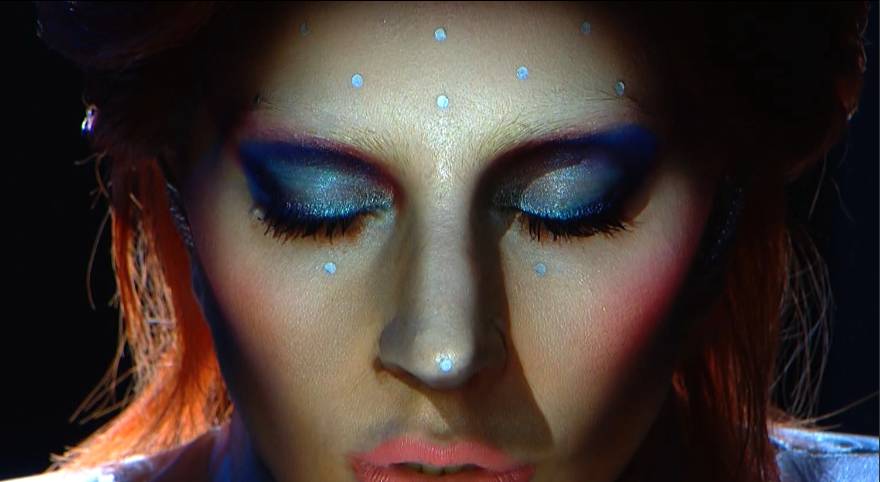 演出一开始Lady Gaga以David Bowie在《Let‘s Dance》中的经典造型登场,神奇的色彩,流动的线条和Gaga的脸型完美融合,英特尔为Lady Gaga开发了一张“动画脸”,精确地追踪她的面部表情并为Gaga进行“数字化妆(digital makeup)”最终将影像立即投影到她的脸上,展现许多Bowie标志性的形象,通过高科技手段再现摇滚变色龙风采。之后随着《Fashion》《Let’s Dance》《Rebel Rebel》和《Heros》等经典歌曲响起,更多的技术也浮现在观众面前。