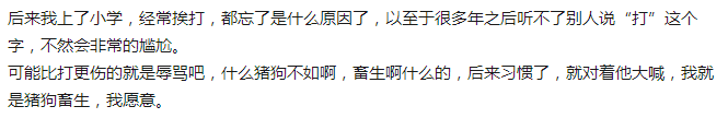 有个匿名用户回答:小时候经常被爸爸打,以至于很多年之后听不了别人说「打」这个字,不然会非常的尴尬。上了高中后,曾经想过自杀,自残,都没能发泄那种恨。