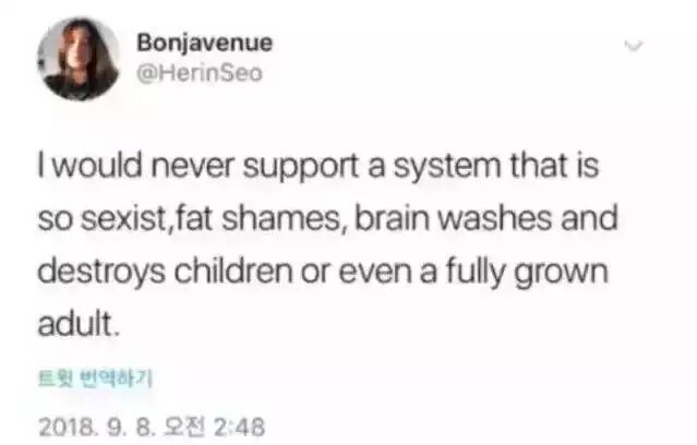 去年,从 SM 公司离开的韩裔英国练习生在自己的推特上发文,表示自己“绝不会支持一个充满性别歧视、身材歧视、洗脑又摧毁小孩和大人的制度”。