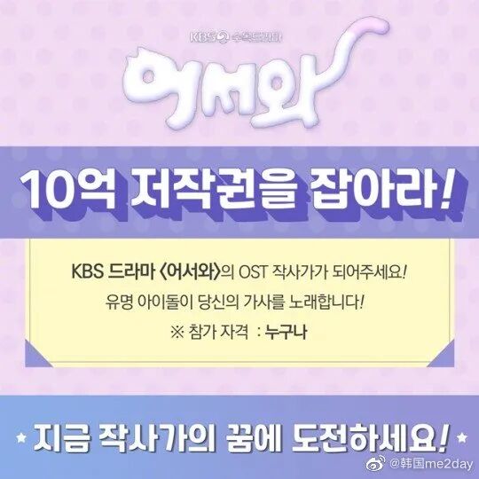 3日,KBS2水木剧《快过来》的OST制作公司Donuts Music N表示:“确定了于2月进行的‘第一届Donats Music N作词征集活动-掌握10亿著作权!’的当选作品。最后优胜者作为作词人参与MONSTA X刘基贤演唱的《快过来》OST《再次春天》(暂译)”。 该曲将于韩国时间9日下午6时通过各大音源网站和Donuts Music N和YouTube频道公开。 (G)I-DLE迷你三辑《I trust》音源试听预告公开 UIE确定出演《SF8》系列电视剧