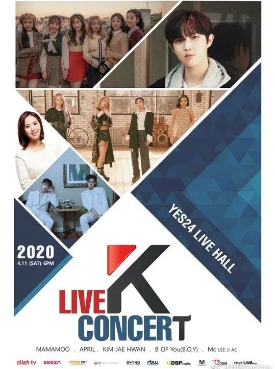 3日,据多家媒体报道,MAMAMOO-金在奂-April-B.O.Y等出演的《Live K Concert》捐款演唱会将于韩国时间11日下午6时通过Olleh TV和Seezn进行直播。该演唱会是可以一边观看人气艺人的演出,一边进行捐赠的双向沟通演出。 该演唱会是为了防止“新冠肺炎”扩散和减少多人聚集的团体活动,也是为了由于演出,体育比赛等文化活动中断后,呆在室内时间变长的国民准备的"善良演唱会"。 募集到的捐款将通过“国际救护开发NGO Good Neighbors”转交给因“新冠肺炎”疫情而陷入困境的团体和国民。