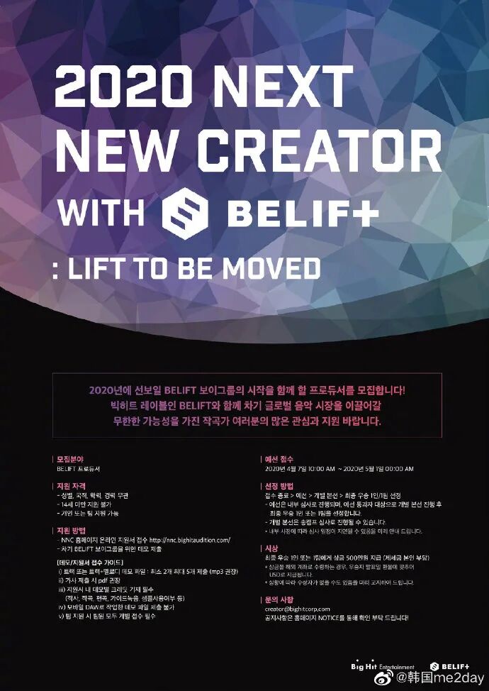 Big Hit和BELIFT将共同招募2020年新男团的制作人。BELIFT最近在选秀官网上表示:“将通过7日到5月1日举行的'NEXT NEWCREATOR WITH BELIFT'选秀选出能引领下阶段全球音乐市场的具有无限可能性的作曲家(制作人)”。 根据该公告,招募的是负责BELIFT即将出道的新男团新专辑工作的制作人,个人或团队也可报名。 BELIFT是Big Hit和CJ ENM为共同制作瞄准全球市场的偶像组合而成立的合作法人。计划年内推出由多国少年组成的新男团,从去年3月到7月在韩国国内外17个城市进行了面试。 MC梦将于10日发行新曲,时隔6个月的回归