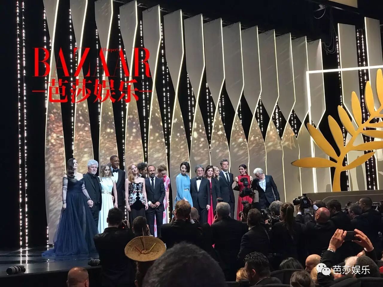 接下来开幕典礼正式开始,以一支探讨电影是否能改变人生的黑白短片开场。接下来一段情歌对唱,映衬着戛纳电影节70周年的过往,台下的芭姐看到这一幕,既觉得震撼,又深深地被触动!