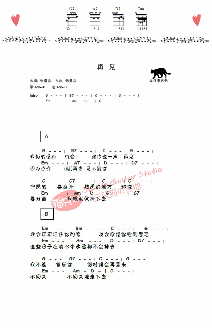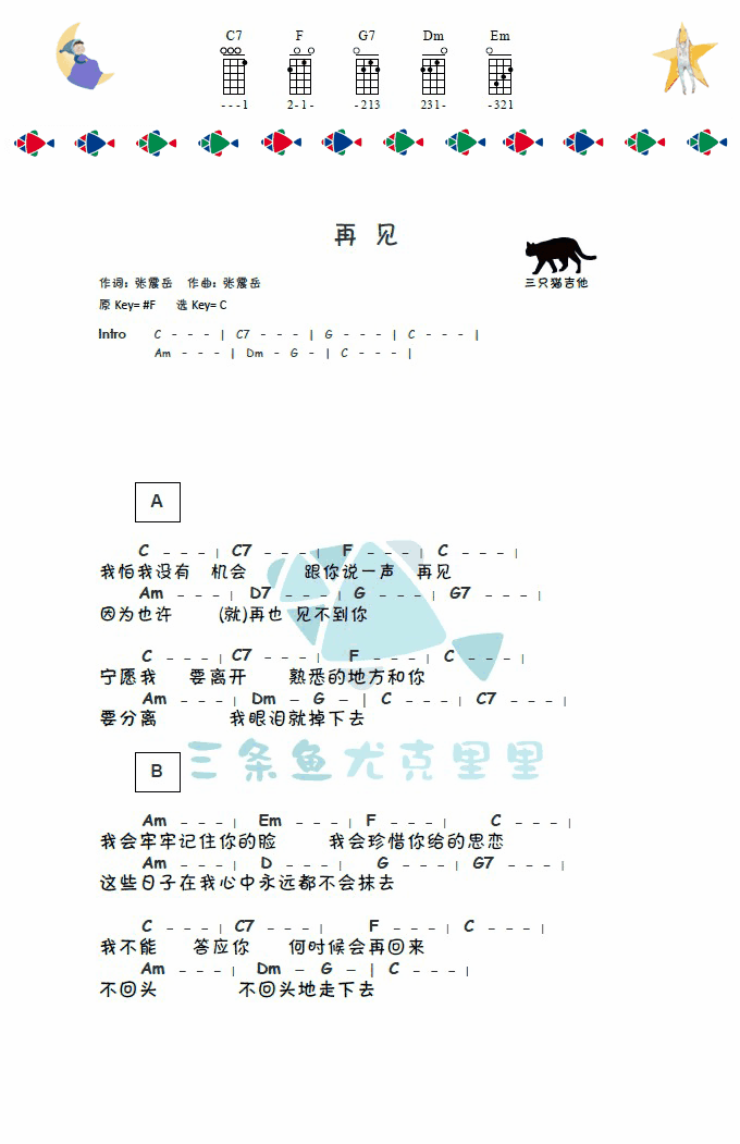 《再见》张震岳 和弦谱 三只猫吉他工作室 港台男星 2017-10-20 13:44:08 382 创作不易,用心坚持,欢迎请BaGua喝几杯爱心咖啡!打赏并支持本文 打赏并删除本文 1吉他2乌克丽丽提示乌克丽丽扫弦一般乌克里里只用两根手指完成扫弦,长箭头使用拇指,短箭头使用食指。和吉他的用指方法完全不一样。吉他也使用这个节奏形演奏。三只猫吉他独家排版设计 创作不易,用心坚持,欢迎请BaGua喝几杯爱心咖啡!打赏并支持本文 打赏并删除本文 感谢您的支持鼓励,我会继续努力的!文章地址:用户邮箱:打赏金额:USDT 请输入数字点击”去打赏“,即可进行打赏支持本文章哦 张震岳 About the Author 三只猫吉他工作室 功能介绍:这里有关于吉他和乌克里里的一切,你还苦苦寻找一个老师或者一张曲谱吗? 回复:歌手或歌曲名字 回复:吉他或尤克里里 Related Posts 《再见》张震岳 和弦谱 2017-10-20 13:44:08 发表评论