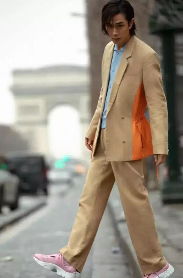 从照片上我们可以看出李承铉穿了一身浅咖色的西装,配了一件浅蓝色的衬衫,配上他的中长发,显得非常的霸气,而除此之外最抢镜的怕是他脚上穿的一双粉红色的鞋子吧,这双粉红色的鞋子给整体暗沉的颜色增添了亮点,达到了撞色的效果,时尚感爆棚,而这双鞋子看上去非常的像是女式鞋,不知道的,还真的以为是穿的戚薇的鞋子呢?