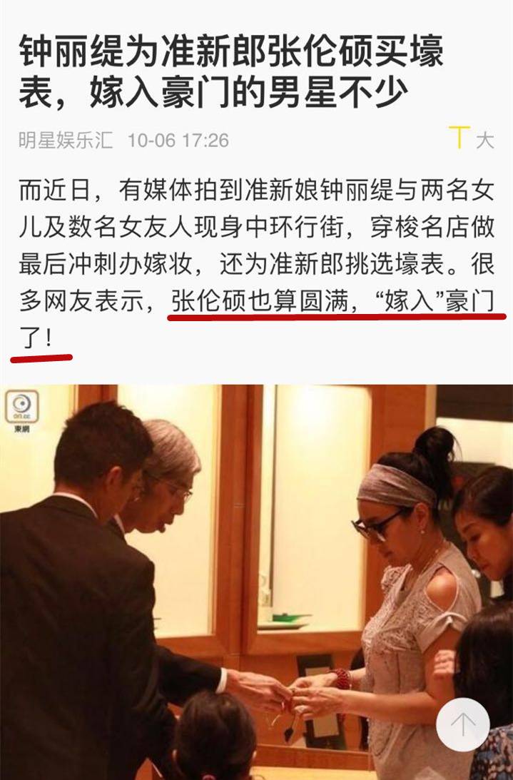 也有人说,两个人名气差这么大,这是张伦硕想嫁进“豪门”吧。而这种说法也一直存在,前段时间钟丽缇被人拍到去店里买表,就有发稿暗讽说张伦硕攀豪门终于成功。