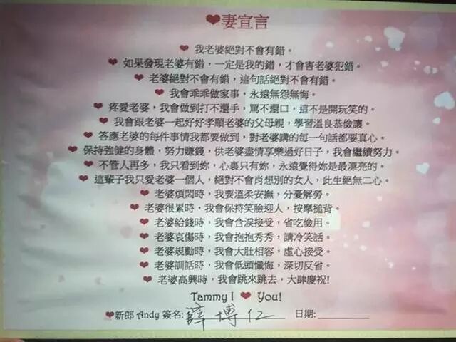 下午结婚仪式上,陈怡蓉身穿一袭白纱由爸爸牵手进场,脸上挂着幸福的微笑,新郎薛博仁原称不会准备誓言,但仍偷偷准备、深情告白:“我的最爱,我要给你的不是二分之一、也不是三分之一,而是全世界。”陈怡蓉则搞笑说,新郎说没准备、她就真的没准备,即兴甜蜜表白:“ 不管喜怒哀乐,我们都要生死与共。”
