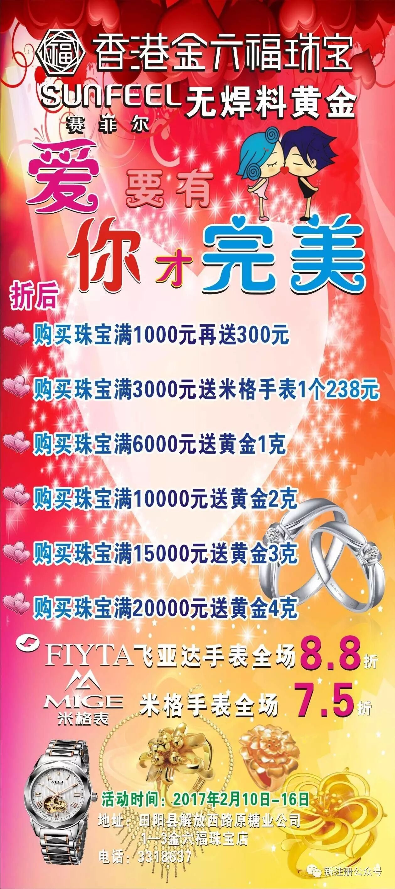 2014年5月加盟由香港明星何家劲代言品牌手表“米格”入驻田阳金六福珠宝