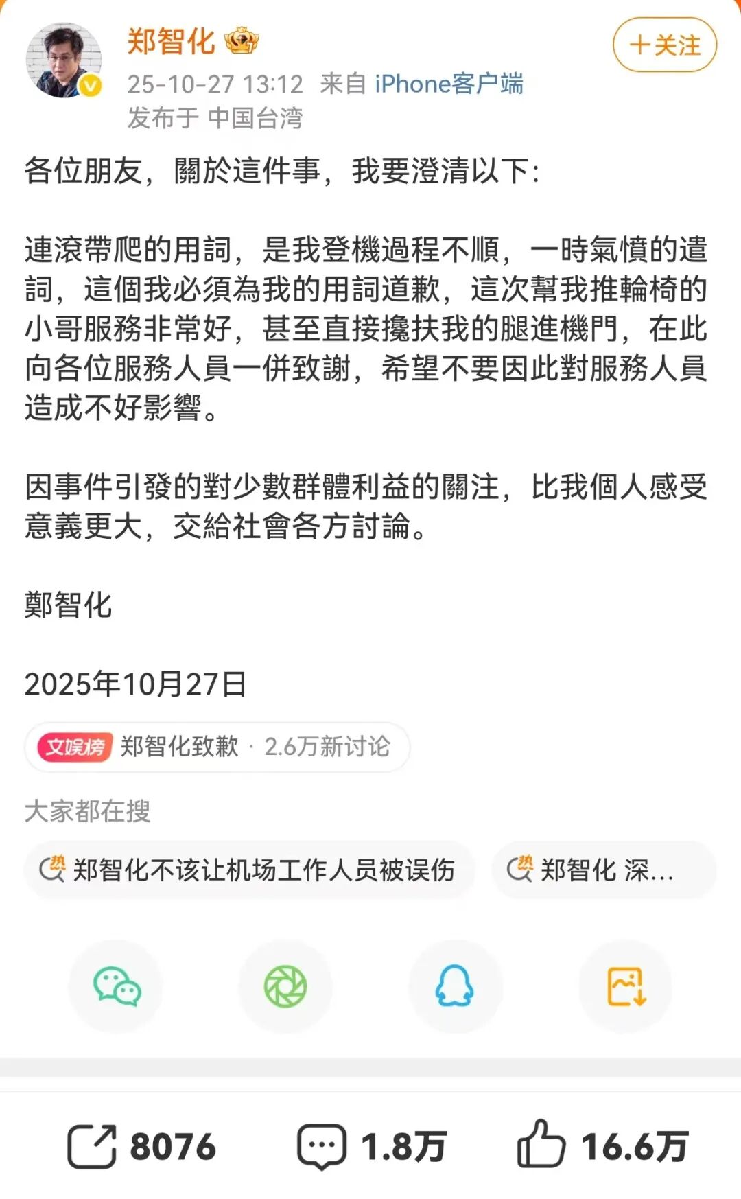 郑智化在10月27日的道歉中承认“连滚带爬的用词,是我登机过程不顺,一时气愤的遣词”,并表示“必须为我的用词道歉”。这一道歉虽说姗姗来迟,但也算为这场风波画上了一个句号。他特别提到“这次帮我推轮椅的小哥服务非常好,甚至直接搀扶我的腿进机门”,这与最初的指控形成鲜明对比,也让那些无辜受到指责的一线工作人员得以正名。