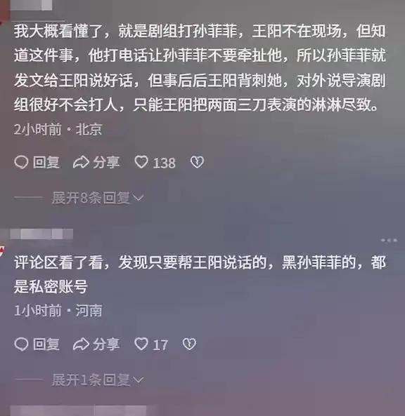 王阳,那个时候是男主角。事件发生时,他不在现场。孙菲菲和他私下聊过导演的脾气,他也觉得导演不好。可在媒体采访时,王阳却说:“导演为人好,不会因为分歧下手。”