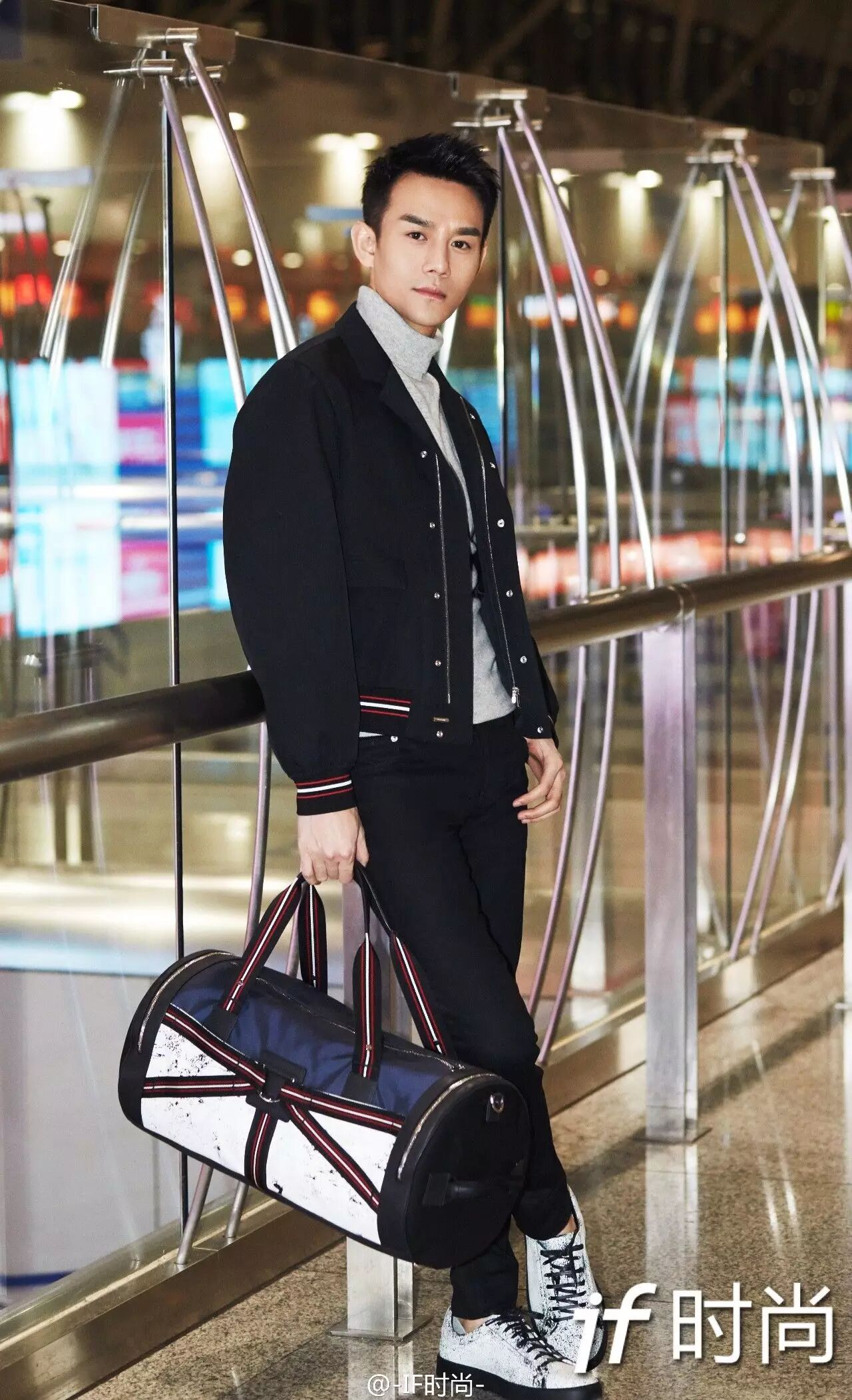▲1月19日,王凯手拿Dior Homme2017夏季条纹绑带手提袋,穿夏季白色喷漆系带皮鞋,亮相机场,启程飞往巴黎。