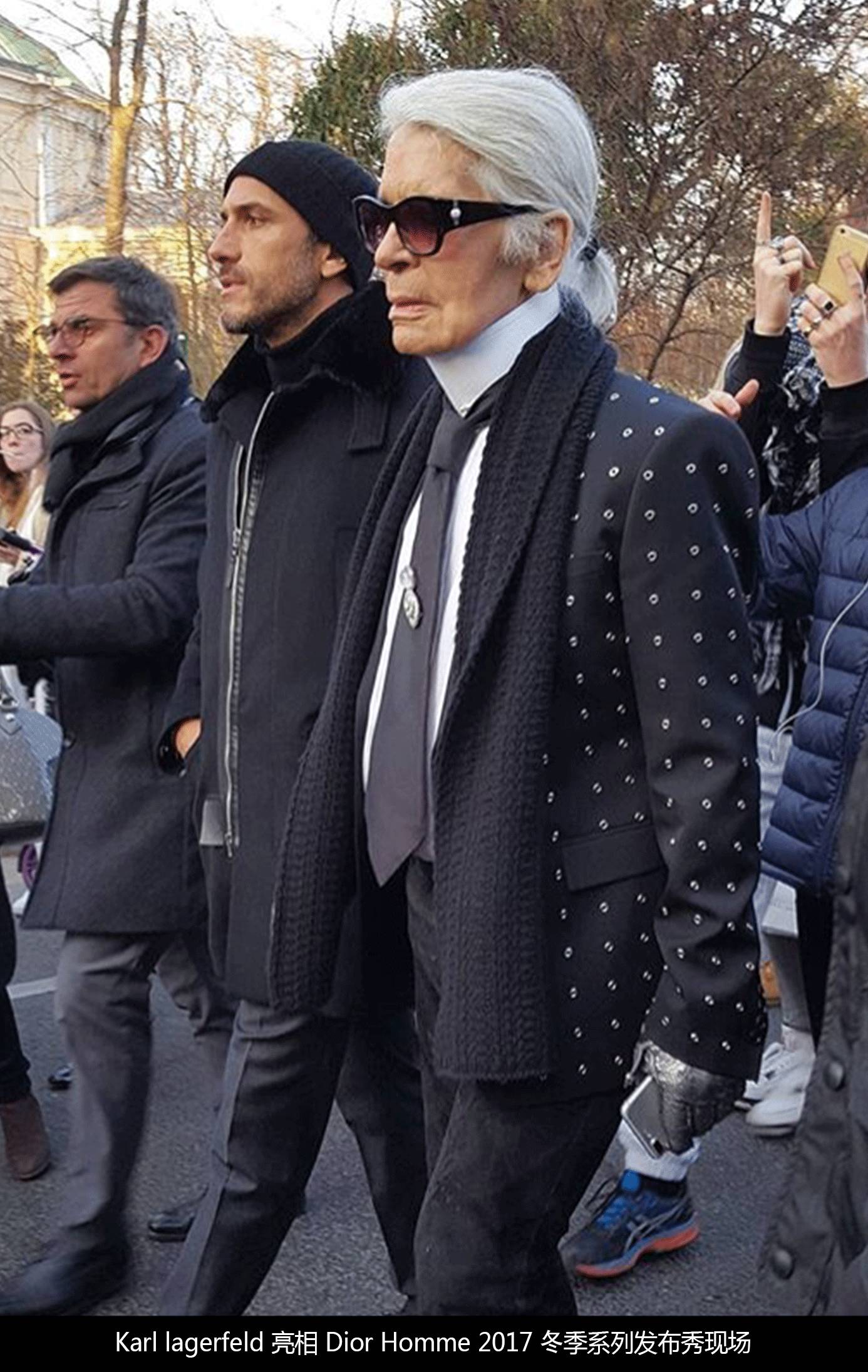 除了“老一辈”艺术家,Dior Homme 对时尚界的大咖也不放过,Chanel家的老佛爷就是Dior Homme的忠实粉丝,为了穿下Dior Homme的套装还励志减肥。