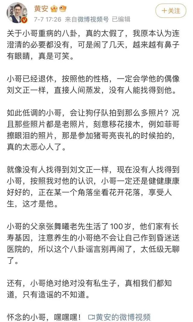 他在文中写道:“关于小哥重病的八卦,真的太假了”“小哥已经退休,按照他的性格,一定会学他的偶像刘文正一样,直接人间蒸发,没有人能找得到他”“那些照片都是老照片,刻意移花接木,真的太恶心人了”。