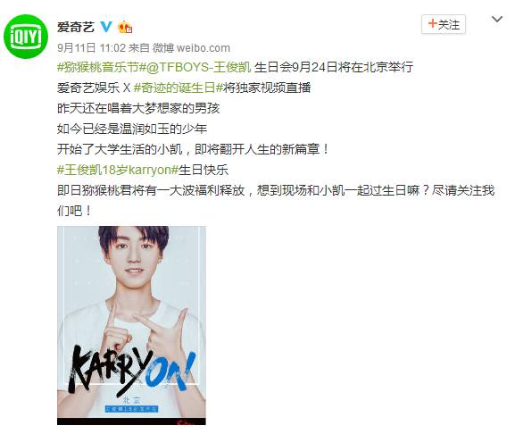 9月21日wuli小凯的生日,也是他十八岁的成人礼!成年啦,是不是意味着女友粉的机会终于来咯!悄咪咪的告诉你:据说这次生日会爱奇艺娱乐独家视频直播喔~而且,看官博的意思,猕猴桃音乐节福利又是大大的有?