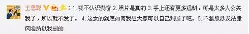 事件曝光后,博主“八卦_我实在太CJ了”发文称王思聪作为贾青绯闻男友秦奋的好友,知道两人分手内情,所以才对贾青那么大为不满。但不久,王思聪就在该微博下评论,称自己并不认识秦奋,手中还有料,但被公关所以不发了。王思聪称:“1. 我不认识勤奋 2. 照片是真的 3. 手上还有更多猛料,可是太多人公关我了,所以就不发了。 4. 这女的到底如何我想大家可以自己判断了吧。5. 不雅照涉及法律风险所以我删的。”