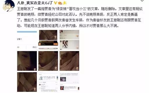 今天中午11时许,王思聪在微博分享了一个来自“全民星探”的爆料链接,同时配文“目测不久就要被和谐了”。点击链接进入,可见一组疑似女演员贾青的不雅照,尺度颇大。同时,该图片爆料人还附文声称,自己是为了替发小出头,要让贾青的脑残粉“知道贾青是个在贵圈里淫荡又乱又好上的女演员”,并称贾青喜欢勾搭有妇之夫。”该爆料立刻在网上引发轩然大波。