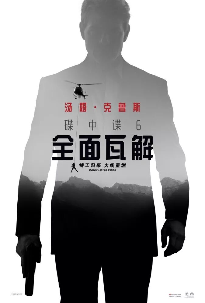 《碟中谍6:全面瓦解》由美国派拉蒙影片公司出品,克里斯托夫·迈考利执导,汤姆·克鲁斯、亨利·卡维尔、西蒙·佩吉、丽贝卡·弗格森、文·瑞姆斯、肖恩·哈里斯、安吉拉·贝塞特、凡妮莎·柯比、米歇尔·莫娜汉、亚历克·鲍德温、韦斯·本特利、费雷德里克·施密特等主演,将于7月27日北美公映。