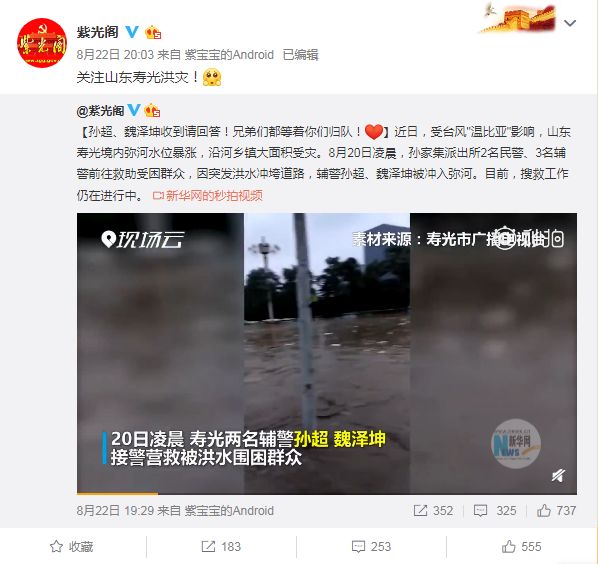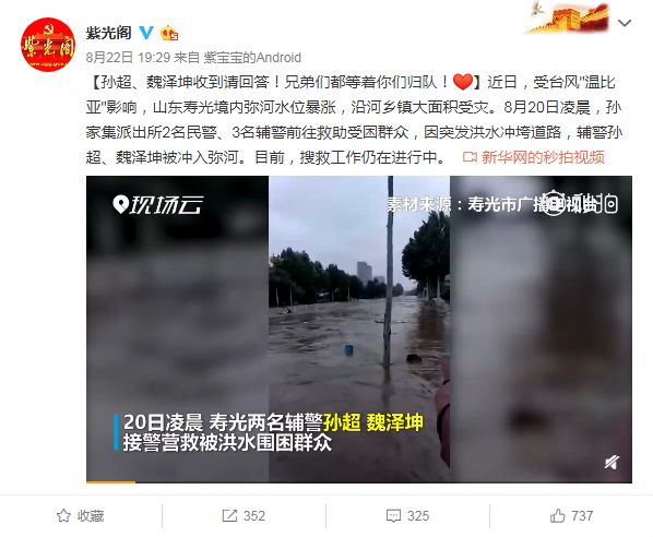 另在20日凌晨,有两名孙家集派出所民警前往救助受困群众时,因突发洪水冲垮道路,被冲入弥河。目前搜救工作仍在进行中。