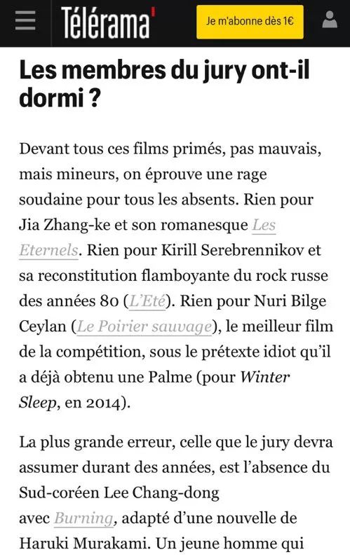 《世界报》还认为:“在我们看来,有三部电影在竞赛片中占据重要的位置,这三部影片同时拥有令人难忘的美学,激进的自我内心反思,它们是中国导演贾樟柯的《江湖儿女》,日本导演滨口龙介的《夜以继日》,韩国导演李沧东的《燃烧》。以上这些特点,可以解释评审团对三位导演的电影之美为什么漠不关心。”