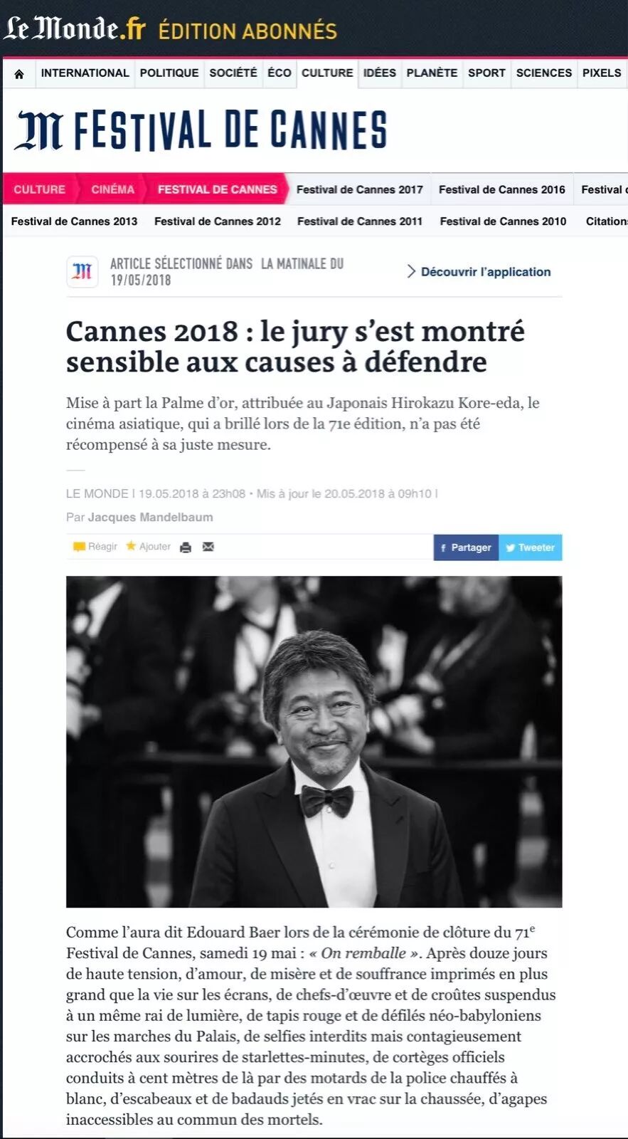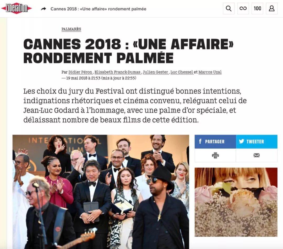 法国《解放报》评论:“评审团的选择能够清晰地呈现他们明确的企图,他们喜欢愤慨的修辞和传统的电影。他们在向戈达尔致敬的同时,放弃了许多本届电影节最优秀的电影。”