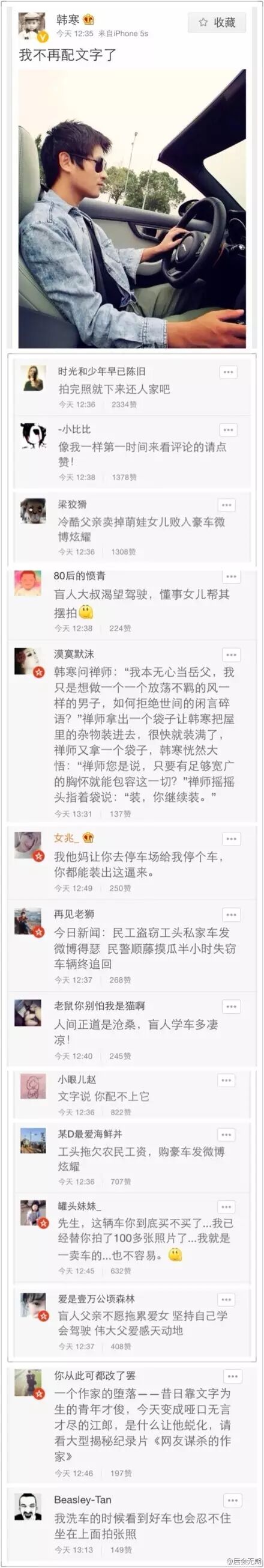 自黑起来最让我惊讶只有岳父一人,在我看来,岳父在书外都应该只是一个爱赛车,不仅舌战陆川高晓松,还能手撕方舟子时刻保持着清醒头脑英明神武的战神。直到我媳妇儿小野(不要和我抢,他家还有个表妹)的出现,岳父在我心中的形象彻底改变。