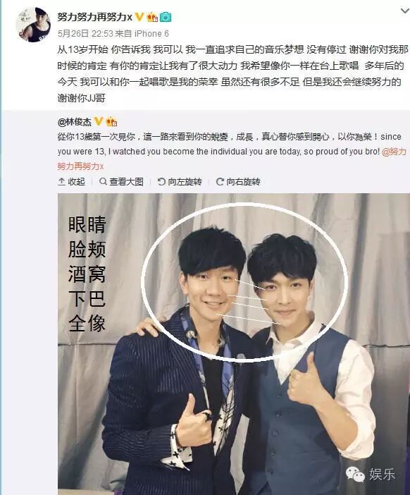 從你13歲第一次見你,這一路來看到你的蛻變,成長,真心替你感到開心,以你為榮!since you were 13, I watched you become the individual you are today, so proud of you bro! @努力努力再努力x。 这个合影众有另外一个人,他就是人称小绵羊的张艺兴。自从参加了极限挑战,张艺兴变得家喻户晓。他的微博留言已经有2万多条,比林俊杰的都还要多,可见他的名气有多热。