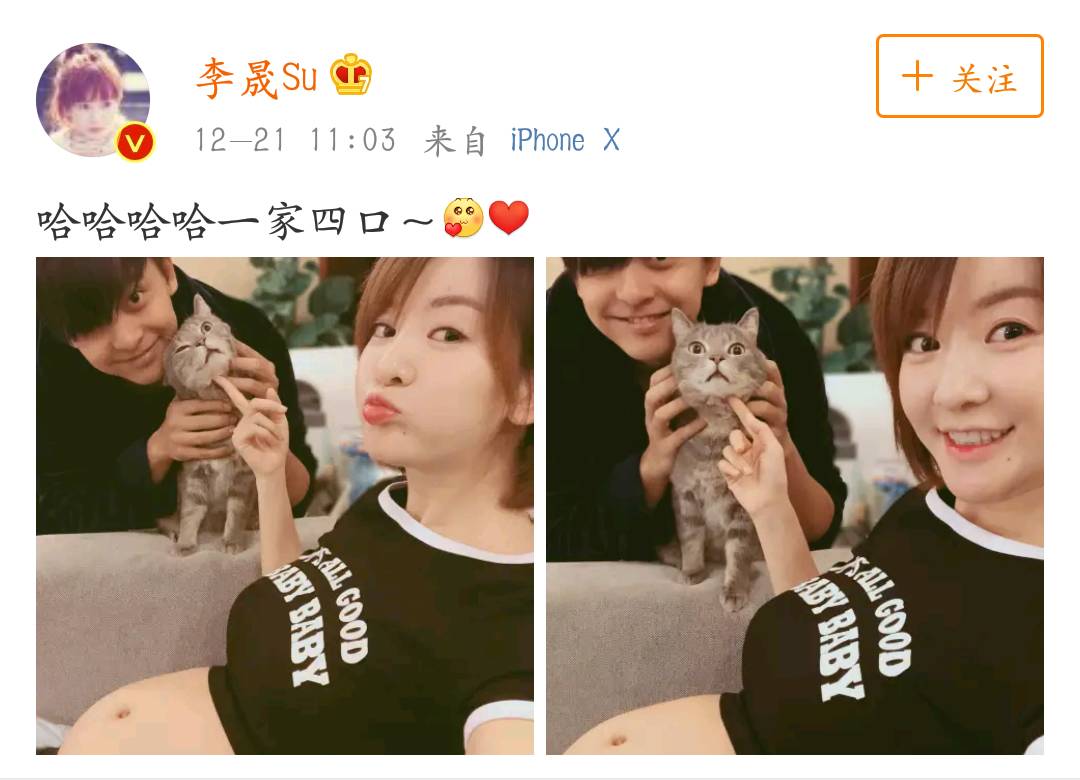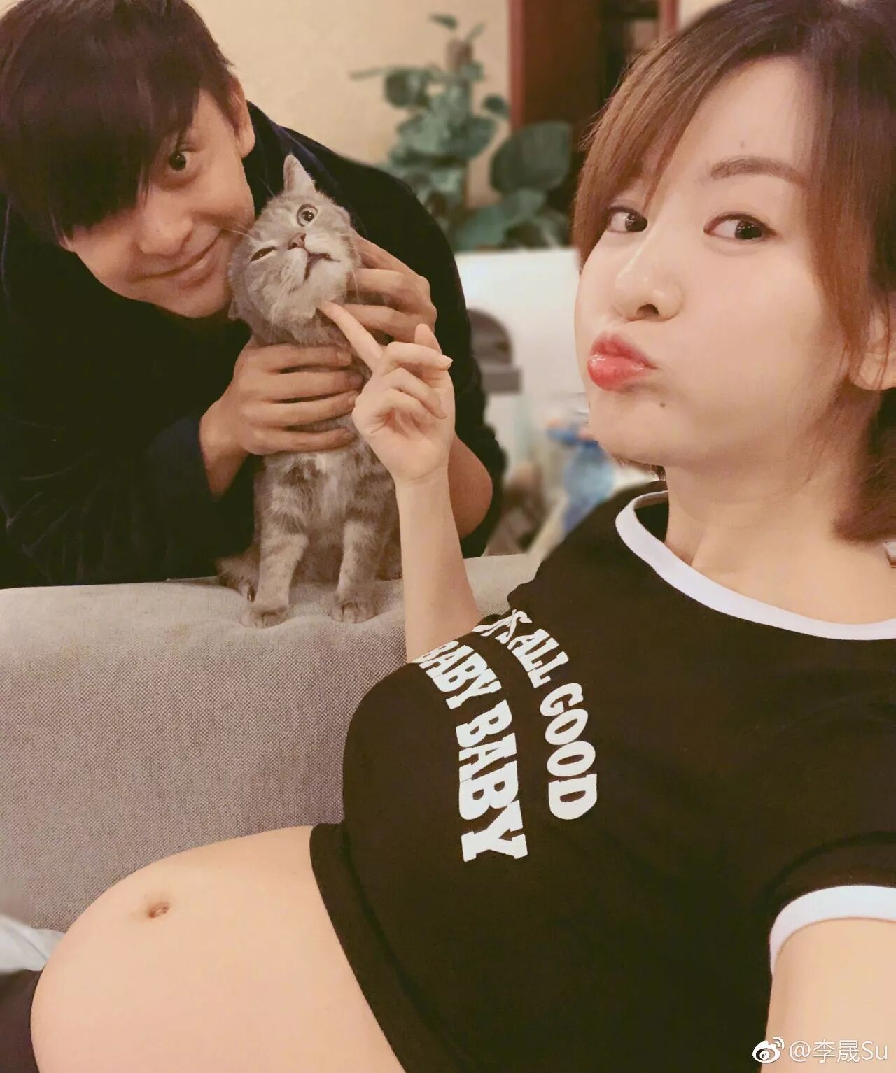 照片中,李佳航抱着猫咪,李晟坐在沙发上,孕肚明显隆起,恭喜二人啦~