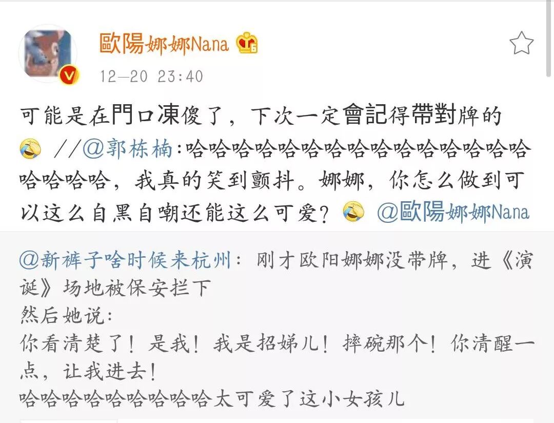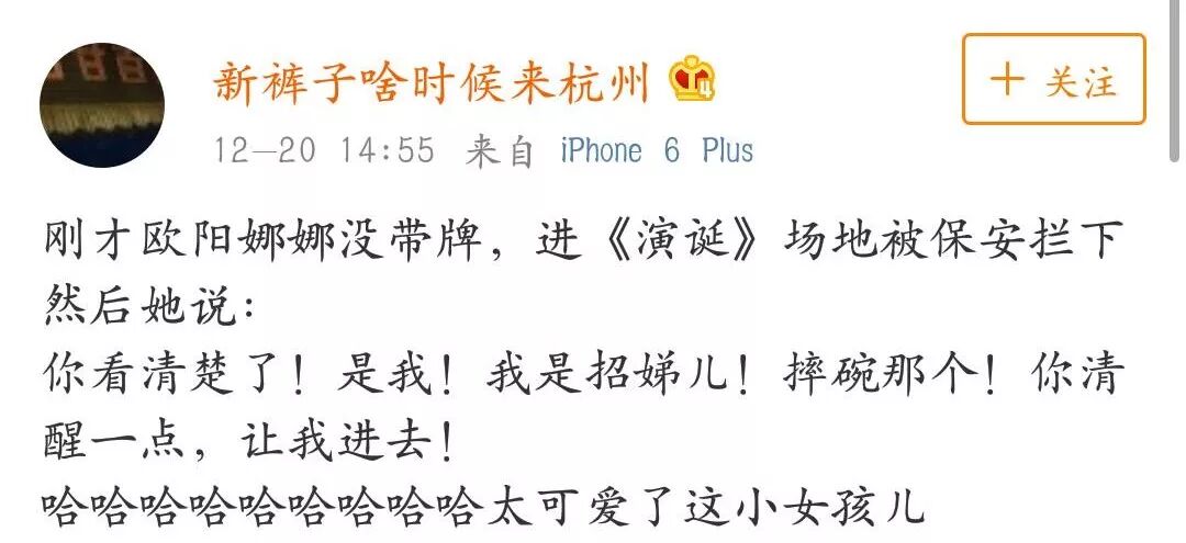 网曝欧阳娜娜因没带牌进《演员的诞生》场地被保安拦下了,于是欧阳娜娜对保安说到:“你看清楚了!是我,我是招娣儿!摔碗那个!你清醒一点,让我进去!”