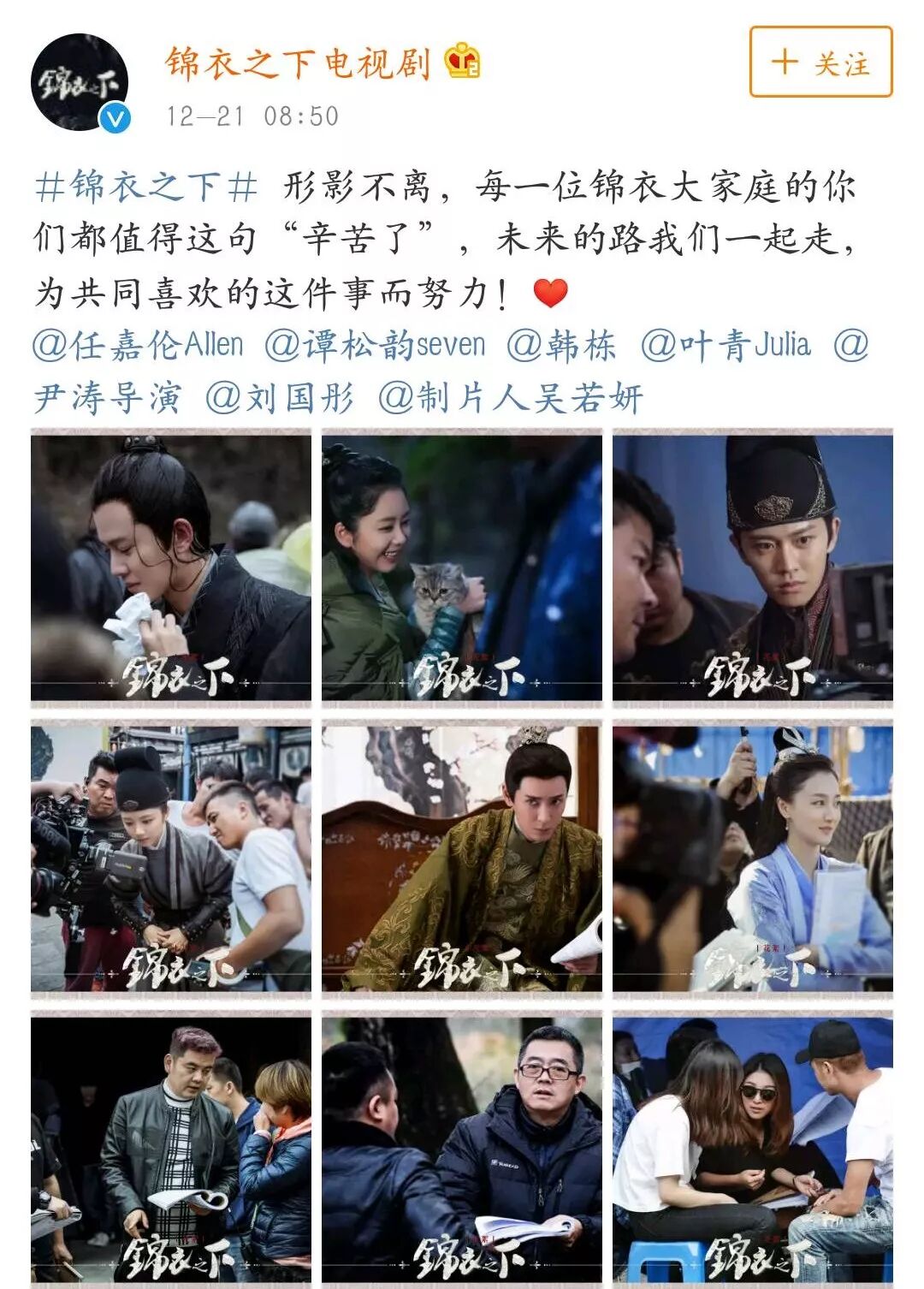 并配文:“每一位锦衣大家庭的你们都值得这句“辛苦了”,未来的路我们一起走,为共同喜欢的这件事而努力!”