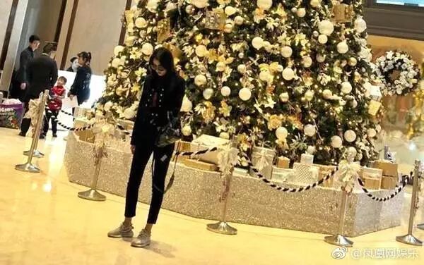 照片中关晓彤在一颗大圣诞树下凹造型拍游客照,十分甜美可爱