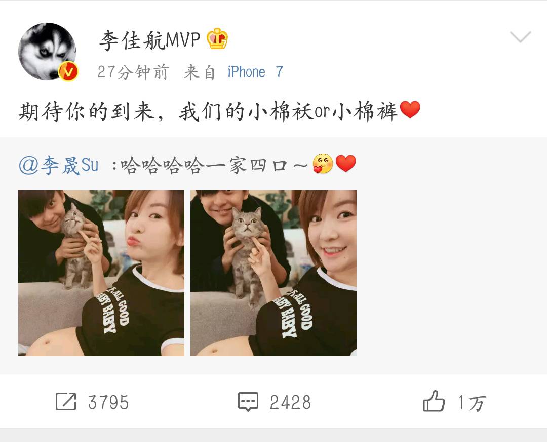 李佳航随后转发称:“期待你的到来,我们的小棉袄or小棉裤。”