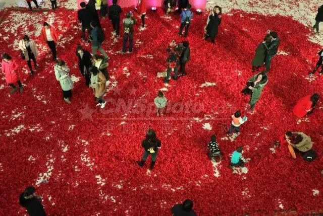 28、情人节杭州一商场铺240万片“玫瑰花瓣”迎客