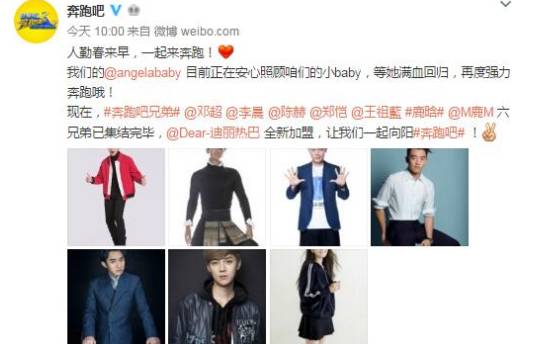 中国新闻网:据浙江卫视《奔跑吧》官方微博消息,《奔跑吧兄弟》第五季(已更名为《奔跑吧》)嘉宾阵容确定,Angelababy由于生子暂时离开,迪丽热巴正式加盟,邓超、李晨、陈赫、郑恺、王祖蓝、鹿晗其余六位嘉宾不变。