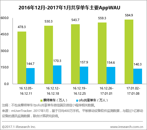 中国经济网:国内市场调研机构艾瑞咨询发布的最新数据显示,共享单车行业中摩拜单车的周活跃用户量已接近600万人,相当于行业第二名的4.2倍。