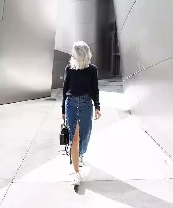 开叉牛仔裙搭配基本款式的上衣完全没有问题,干练又不失女性魅力。
