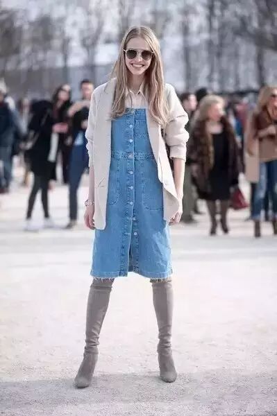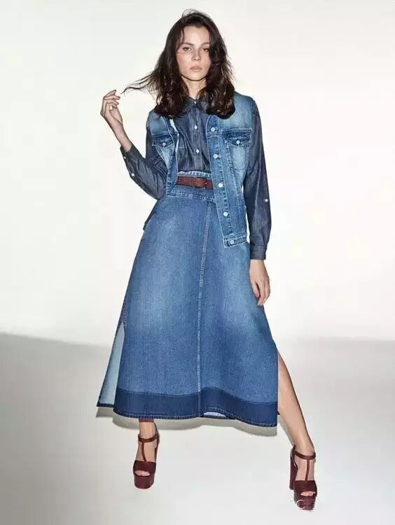 长款牛仔裙,很好地显示出了腰部,高个子的姑娘可以轻松驾驭,虽然拉长了腿的部分,但是不建议小个子的姑娘们穿,因为会显得很臃肿!