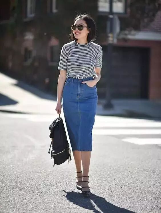 前面开叉的牛仔长裙散发着女性的性感。如果你的腿部线条没有那么完美,那就可以尝试稍稍宽松一些的直筒铅笔牛仔裙,搭配一双漂亮的尖头高跟鞋可以帮助拉长身材比例。