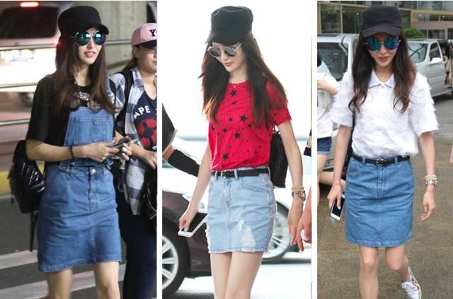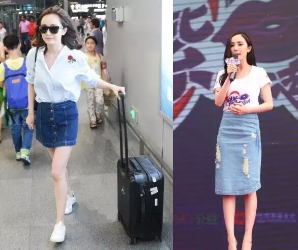 辣妈大幂幂就非常钟爱牛仔裙,无论是跑通告还是机场照都能看到她身穿牛仔裙的身影。