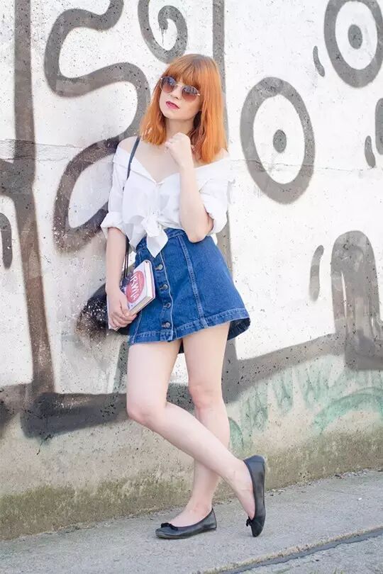 穿上纽扣牛仔短裙有木有显得腿很长呢?适合小个子的姑娘们哟~