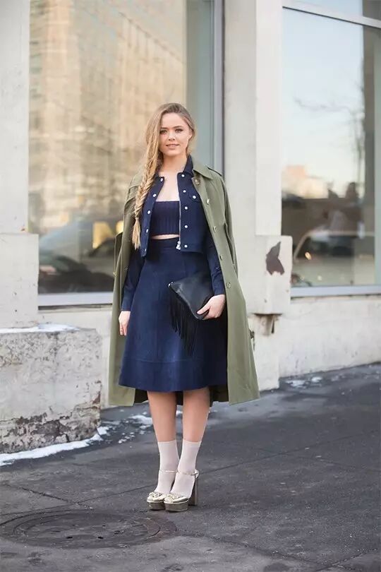 深靛蓝,穿着显成熟,配上高跟鞋,适当露出脚踝会更好哦~