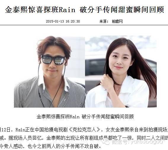 前阵子传过假消息说金泰熙和Rain要在2015年底结婚,Rain辟谣也不忘说一句“目前还没有结婚计划,如果有消息会亲自发表的。”