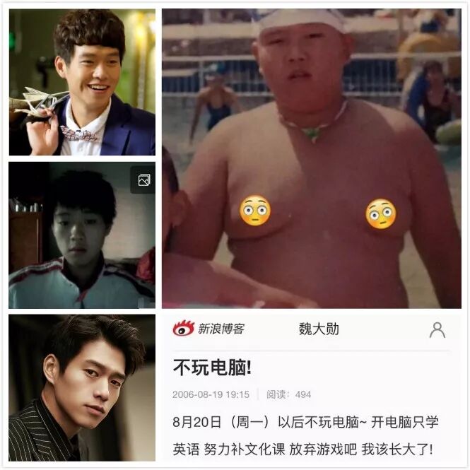 有网友扒出2006年魏大勋的博客,以后不玩电脑~开电脑只学英语,努力补文化课,放弃游戏吧,我该长大了。看到当年他的博客、照片,真是青春年少满满正能量,只是猛然间发现的这个胖纸,真的是你吗?