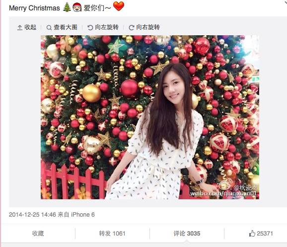 而秋瓷炫这头也在微博发了一颗圣诞树的照片!
