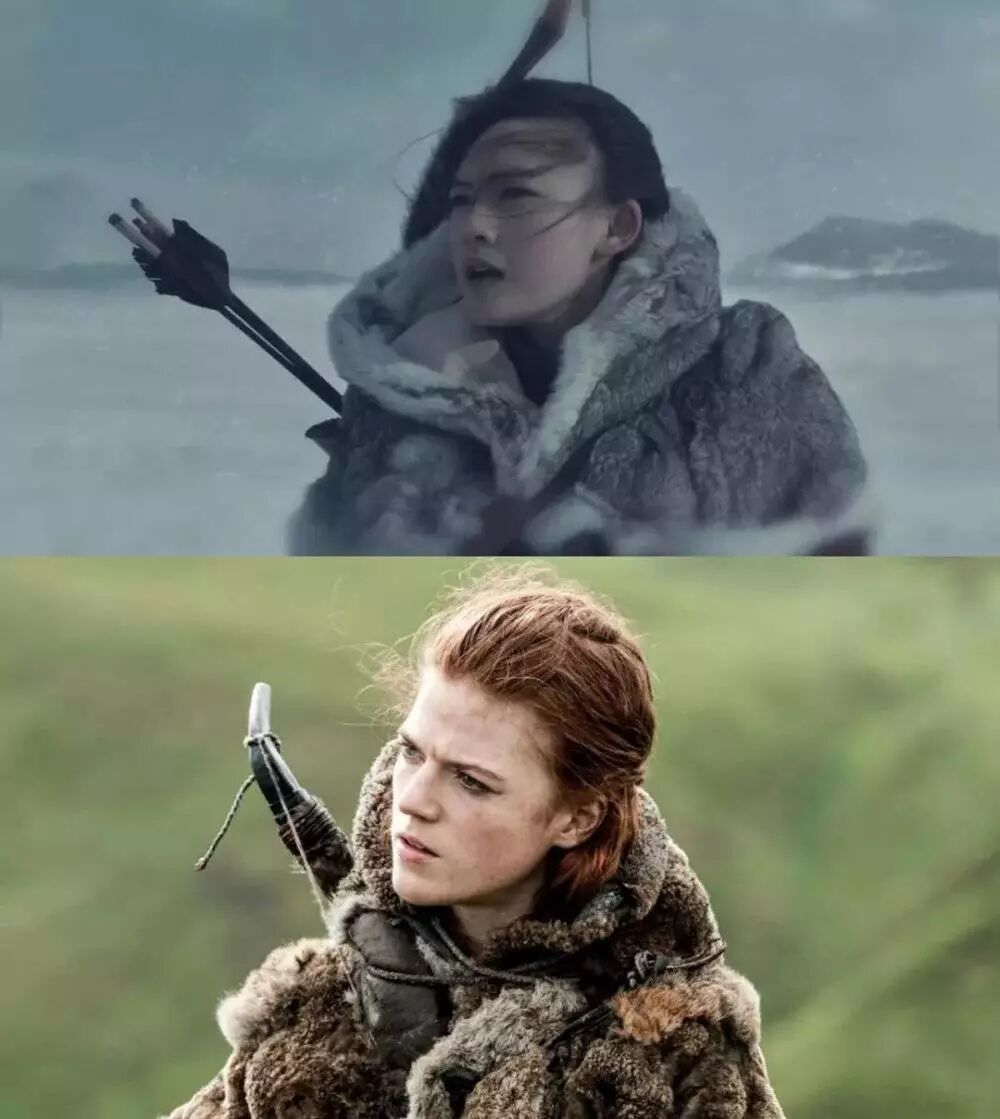 好像不止片头制作团队,《天坑鹰猎》的造型团队里也混进入了权游爱好者,当女主角在雪地里背着弓箭登场时,我还当是火吻而生的耶哥蕊特呢。