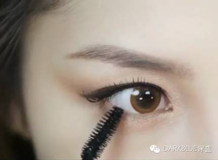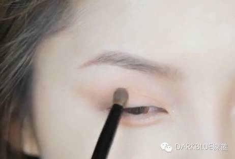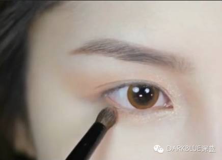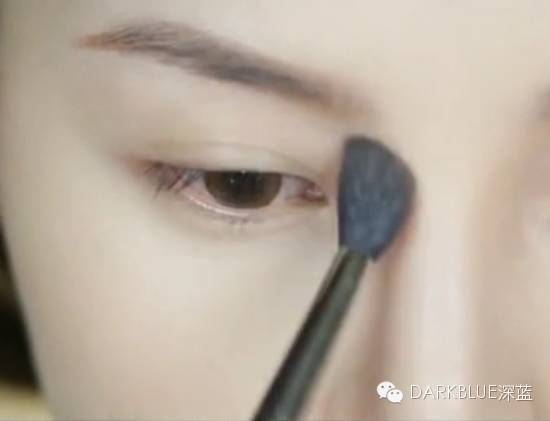 用最浅色从内眼角开始往后扫到眼睛中间,然后从睫毛根部往上大面积涂扫逐渐加深,注意不要盖过之前的浅色眼影。